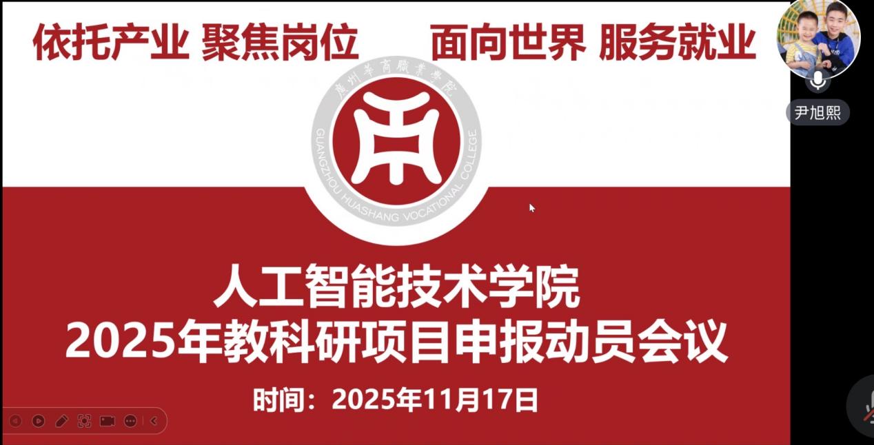 为深入贯彻落实学校“科研强校、产教融合”发展战略,切实提升教师教科研能力与项目申报质量,2025年11月17日,人工智能技术学院通过线上腾讯会议召开2025年教科研项目申报动员会。学院全体教师参会,会议由尹旭熙副院长主持。会上,尹旭熙副院长围绕“依托产业、聚焦岗位、面向世界、服务就业”的核心理念,系统解读了近期各级各类教科研项目申报政策,重点梳理了校级教育教学质量与教学改革工程(含课程思政示范计划)、校级...