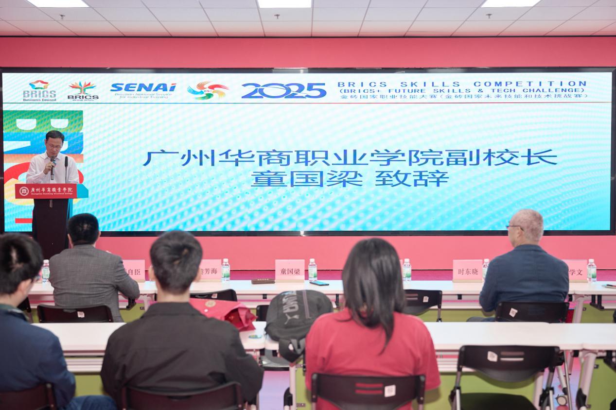 随后,广州华商职业学院副校长童国梁代表学校致欢迎辞,向远道而来的各位嘉宾、裁判及参赛选手表示热烈欢迎。他在致辞中回顾了金砖国家职业技能大赛的发展历程与宗旨,强调了人工智能技术在推动产业变革与人才培养中的重要意义,并预祝全体选手赛出水平、取得优异成绩。