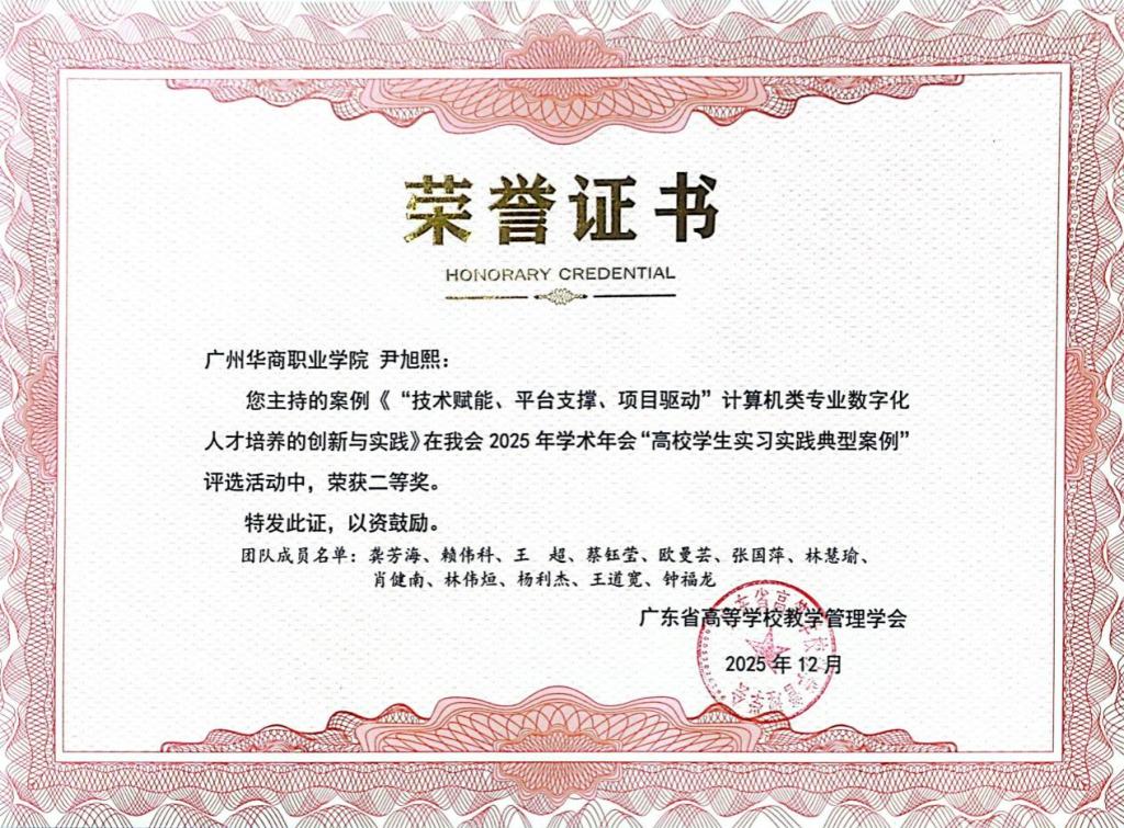 近日,广东省高等学校教学管理学会公布了2025年学术年会“高校学生实习实践典型案例”评选结果。人工智能技术学院申报的《“技术赋能、平台支撑、项目驱动”计算机类专业数字化人才培养的创新与实践》案例,从全省高校提交的280项案例中脱颖而出,荣获二等奖,彰显了我校在应用型人才培养和教学改革方面的显著成效。