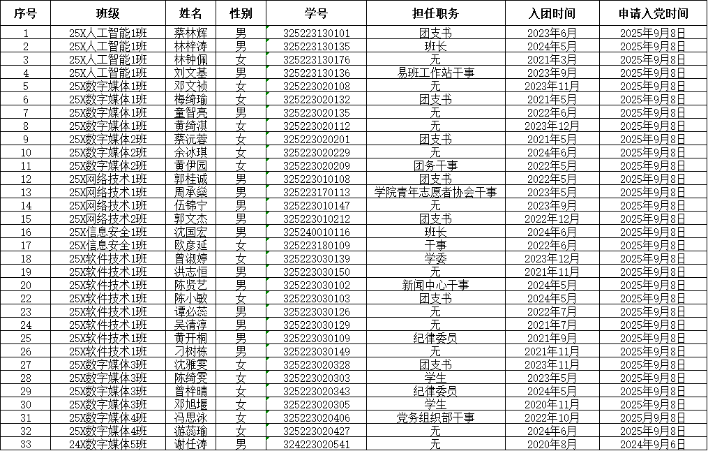 共青团是中国共产党领导下的先进青年群众组织,是党的助手和后备军。推荐优秀团员成为党的发展对象是党赋予共青团组织的一项光荣任务,是“党建带团建”的具体体现,也是团组织的一项重要工作。为促进我校“团组织推优”工作制度化、规范化,建设一支数量充足、素质优良的入党积极分子队伍,经个人申请、各支部依程序召开推优大会,现将人工智能与数据学院团组织推优名单公示如下: