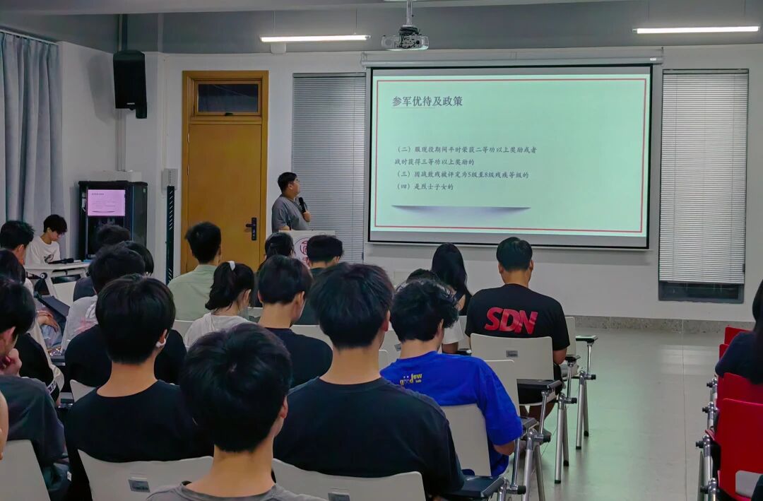 同时详细解读了大学生参军优待政策。他提到,为鼓励青年学子投身国防事业,政府和教育部门出台的系列文件,为大学生入伍提供全方位保障——不仅享受学费补偿、国家助学贷款代偿,退役后在升学深造、就业安置等方面更享有政策倾斜。他号召同学们主动了解政策细则,把握这一实现个人价值与报国理想的宝贵机遇,为未来发展开辟更广阔的道路。