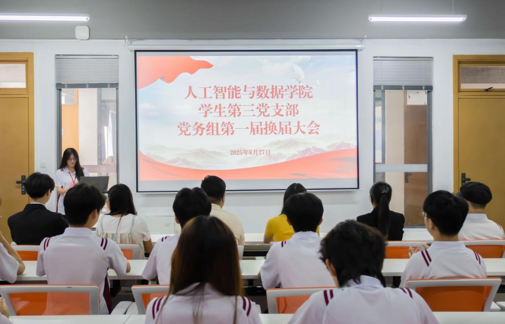 为进一步加强学院党务工作队伍建设,推动党务组工作高质量发展。人工智能与数据学院学生第三党支部于2025年6月27日中午在启超书院11D008举行换届大会。此次大会不仅是对过往工作的总结与回顾,更是对未来发展的规划与展望。此次大会由郑海瑶主持。