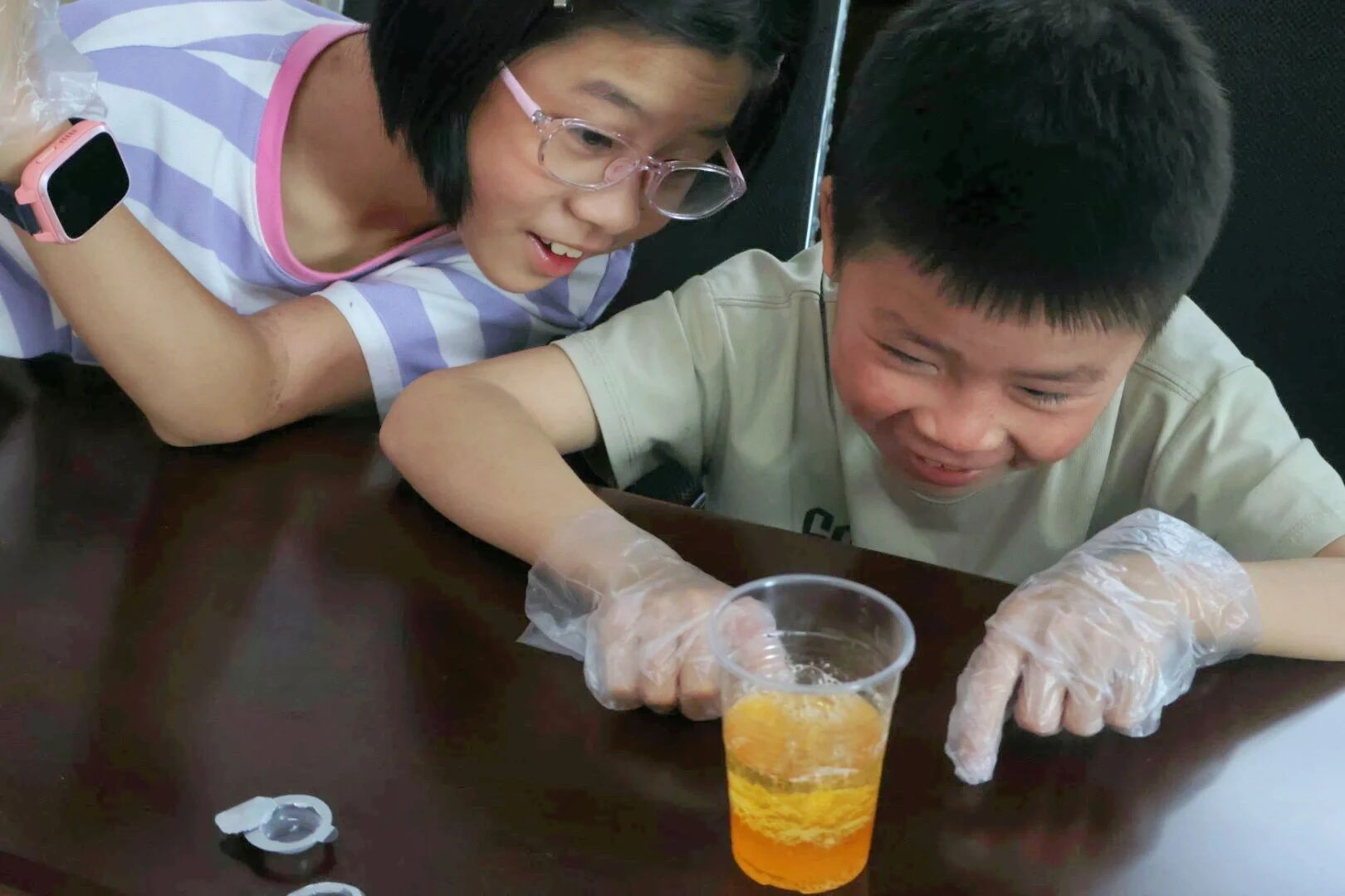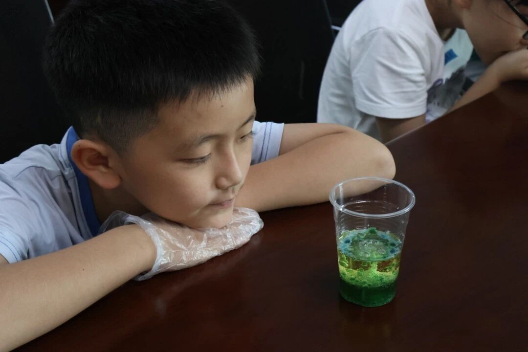 午后的科学探索继续升温,熔岩喷发实验率先登场。孩子们分组领取清水、色素和泡腾片,小心翼翼滴入红色色素,倒入食用油后放进泡腾片 ——“岩浆” 带着彩色泡泡翻滚上升,像火山喷发般壮观。