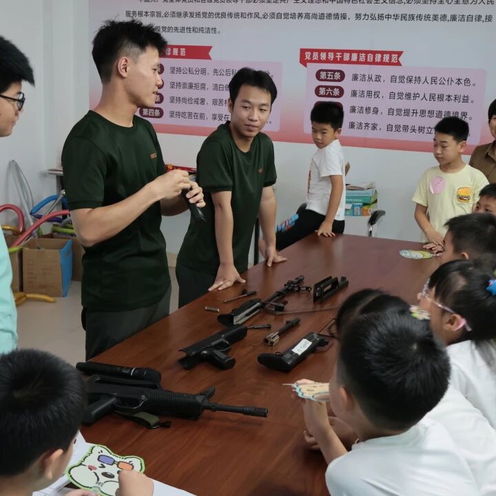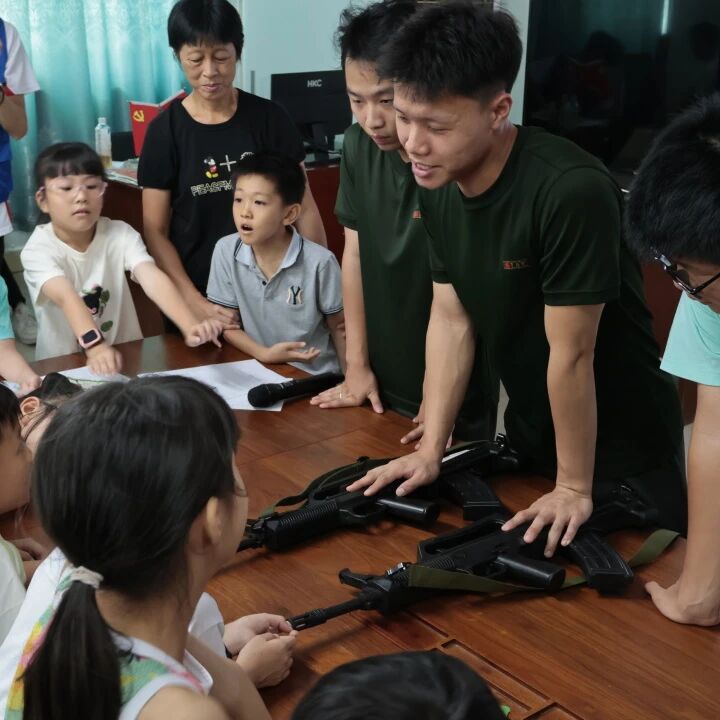 接着进行的“心系国防”课程,志愿者们带领孩子们走进国防知识的世界,了解国防的基本概念、军旗军徽的意义以及解放军的军种与装备。课堂以丰富的图文资料和仿真道具讲解相关知识,让孩子们感受到祖国军队的强大力量,激发了他们的民族自豪感和爱国热情。