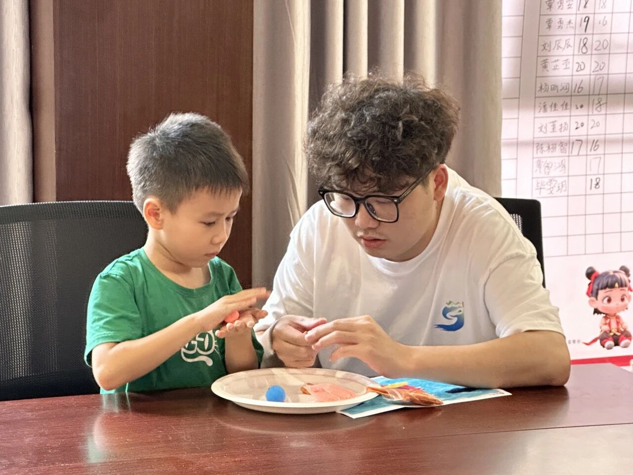 孩子们迫不及待地拿起粘土,尽情发挥天马行空的想象力,开启了一场创意之旅。不一会儿,一个个鲜活的作品就在他们手中诞生了:有栩栩如生的小章鱼,仿佛下一秒就要挥动触手游起来;有令人垂涎欲滴的汉堡,那层层叠叠的模样似乎正散发着诱人的香气;还有小朋友特意捏出了实践队队员的模样,稚嫩的手法里满是真诚与喜爱。孩子们一边制作,一边分享着彼此的创意,整个活动现场都回荡着欢声笑语。当他们高高举起自己亲手完成的作品时,脸上洋溢的自信与自豪,像阳光般灿烂夺目。