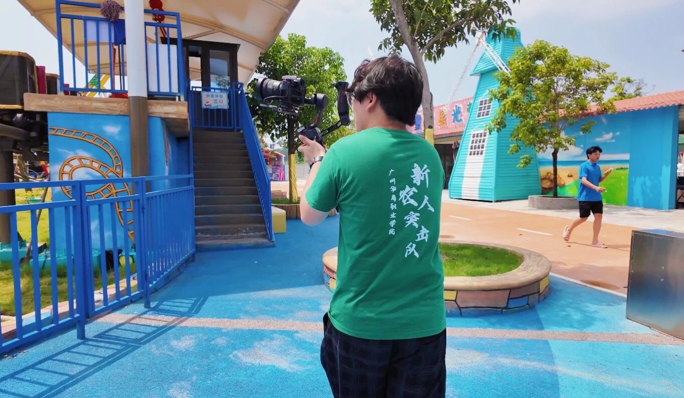 突击队成员深入欢乐湾各主题园区,使用专业云台相机RONIN-SC进行多角度拍摄,捕捉别具一格的精彩欢乐瞬间。在旋转木马、冰雪王国、卡丁车场馆等热门区域,队员们通过镜头记录游客的欢笑与互动。身着印有“广州华商职业学院数字新农人突击队”标识队服的成员穿梭于园区,结合光影构图与场景叙事,生动展现了欢乐湾“亲子休闲+主题娱乐”的特色。