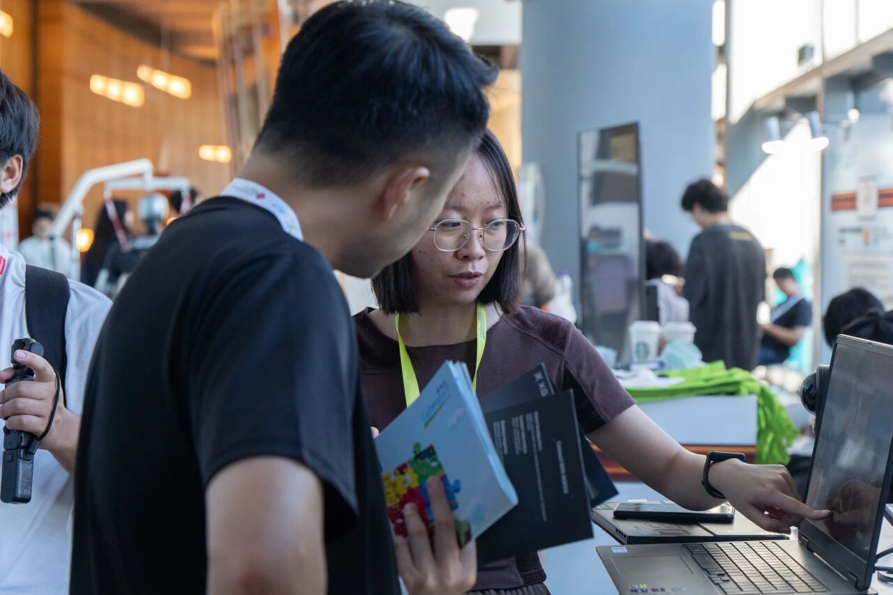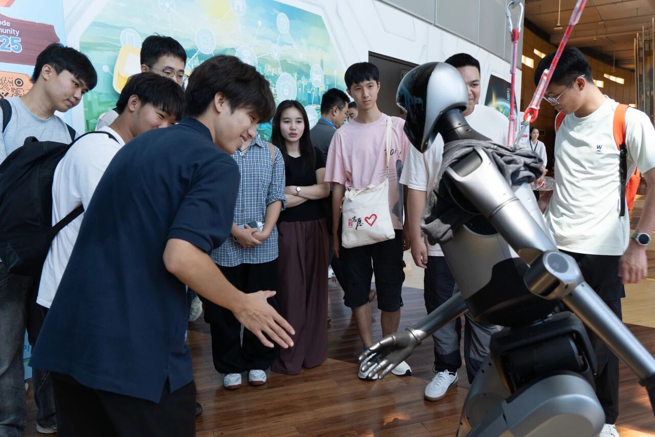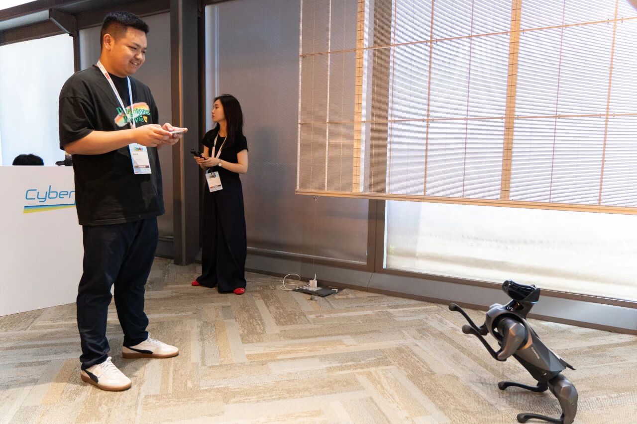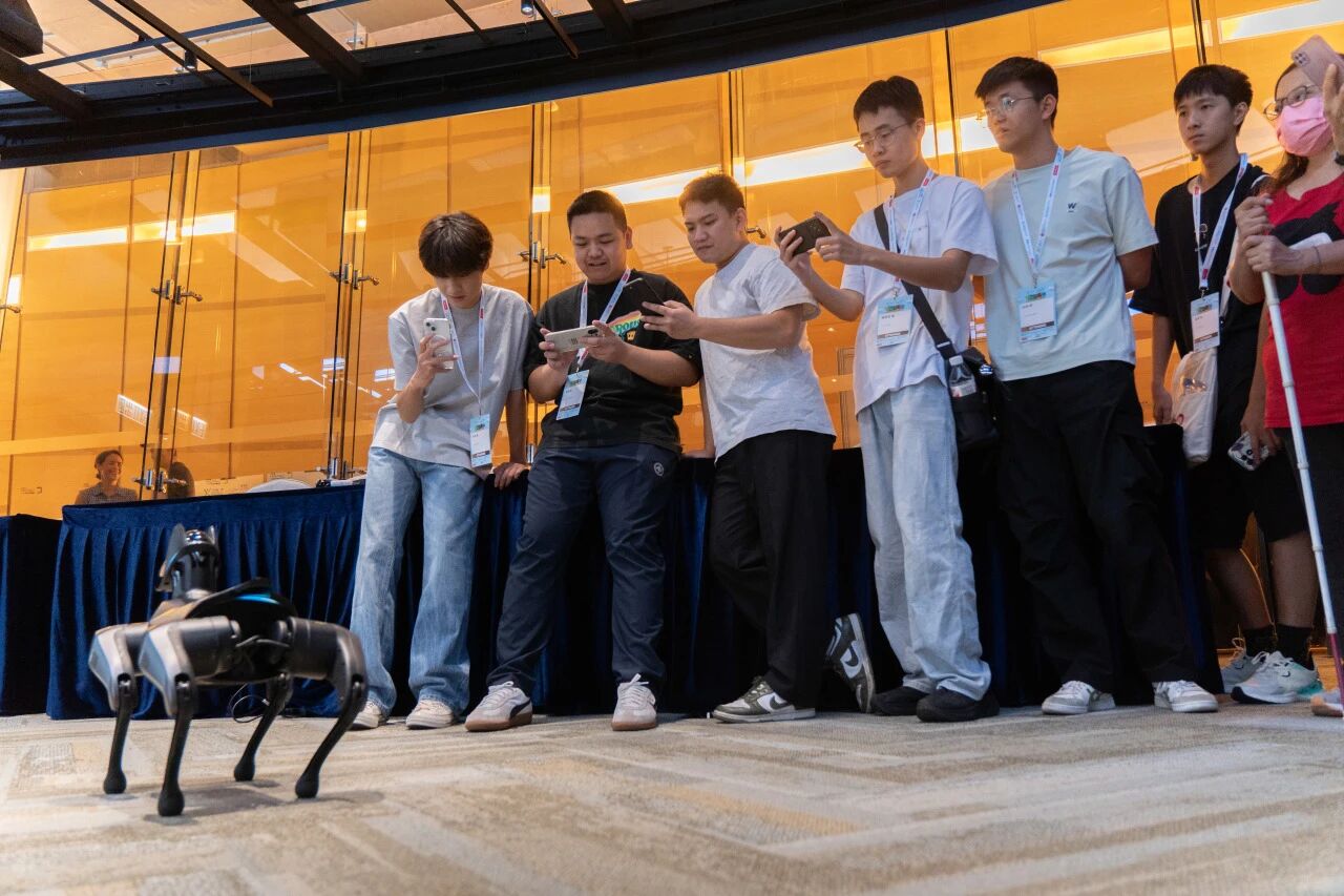 AI 机器狗互动区,同学们亲手操控机器狗完成翻滚、俯卧撑等动作,期间,尝试调整设备参数,在协作中进一步提升了动手实践能力与团队协作意识。在动手实践中深化对 AI 控制算法的认知。这种沉浸式体验,为不同专业的同学打开了通往前沿科技的大门,进一步明确了未来发展的方向,在与同行伙伴的深入交流中,大家拓宽了视野,激发了创新灵感和学习内驱力。