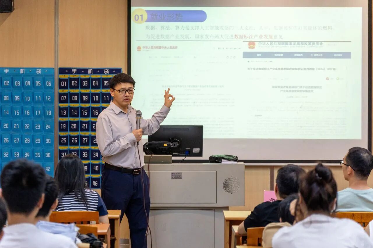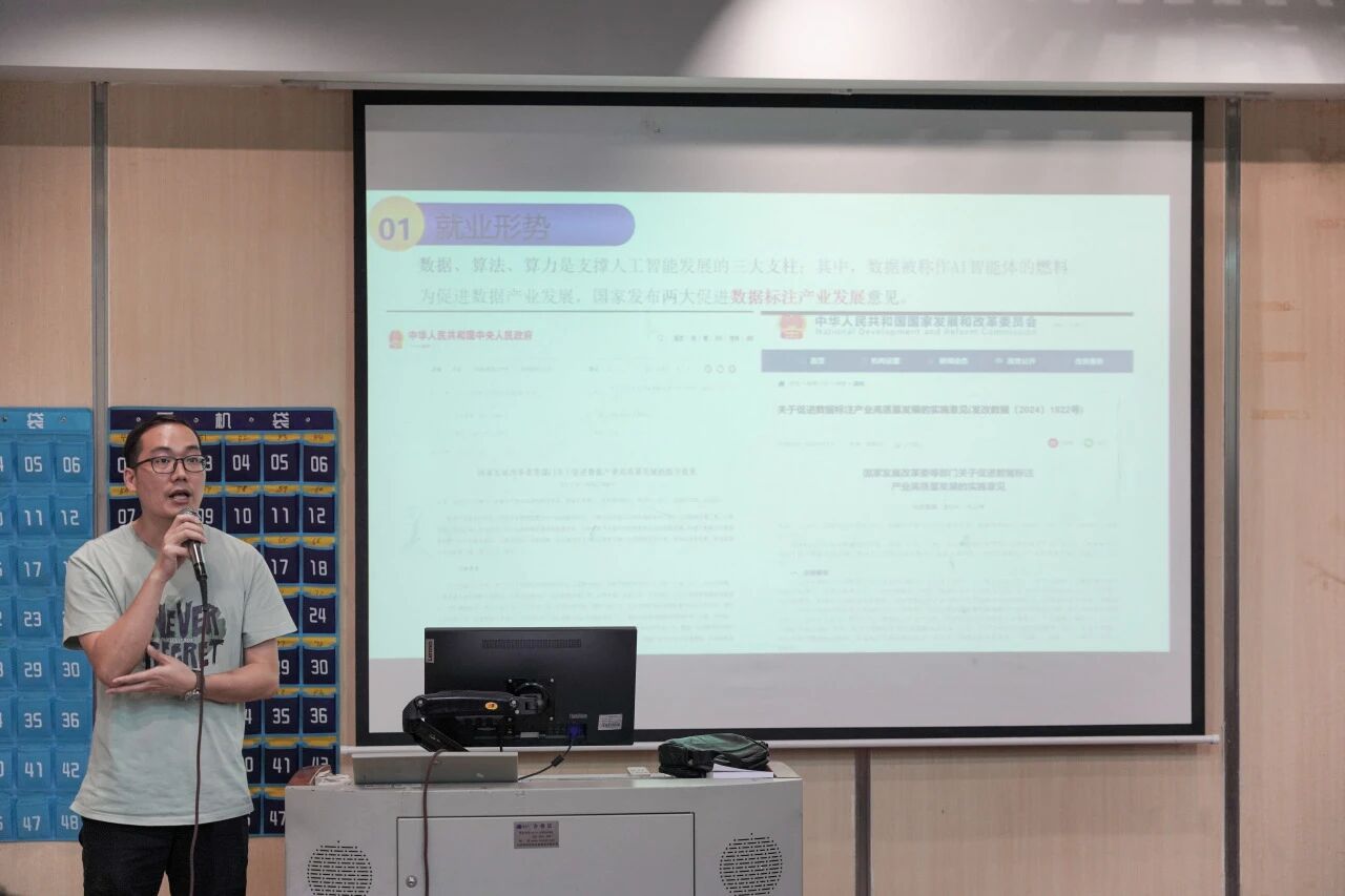 人工智能技术应用技术员赖伟科围绕技术应用层面,讲解了数据标注、数据清洗等岗位的核心技能要求,使同学们对岗位工作内容有了直观认知。同时他还针对学生关心的“岗位门槛”问题,给出清晰答案——入门阶段注重“细心+耐心”,但长期发展需要沉淀。