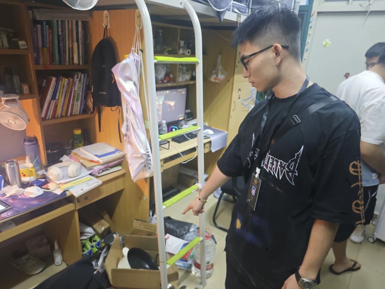 在走访的过程中,老师和学生干部们与同学们亲切交流。他们仔细询问大家的生活近况,叮嘱大家重视宿舍卫生,定期打扫,保持整洁舒适的居住环境。同时,针对蚊虫较多的情况,提醒同学们做好防蚊措施,如及时清理积水、使用驱蚊用品等。