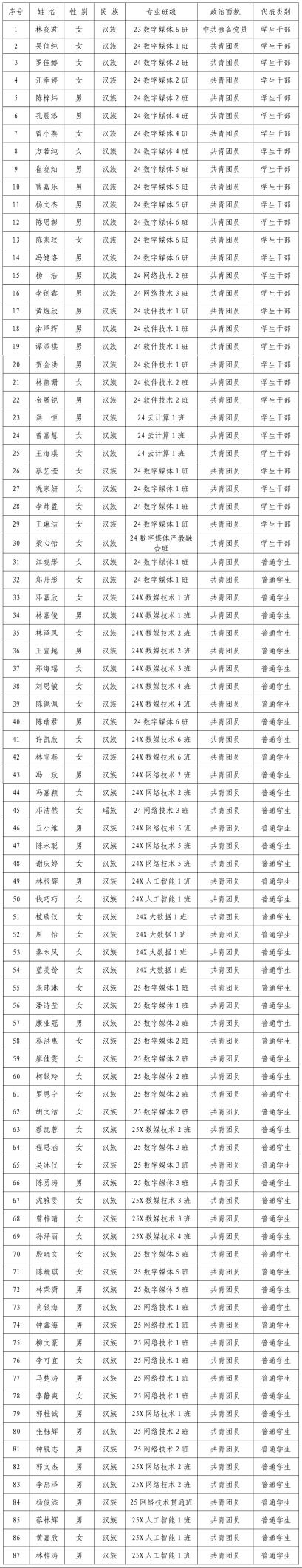 根据《中华全国学生联合会章程》《广东省学生联合会章程》《广州华商职业学院人工智能与数据学院学生会章程》的有关规定,结合学院学生会工作实际,拟定于2025年12月上旬召开广州华商职业学院人工智能与数据学院第二次学生代表大会。现将学生代表名单公示如下: 公示期为2025年11月28日至2025年11月30日,共3天。如有异议,可于公示期内向人工智能与数据学院团委提出。 共青团广州华商职业学院 人工智能与数据学院委员会 2025年11月28日 图文:陈煜仪 初审:李美汝 复审:吴欣瑶 终审:叶锐